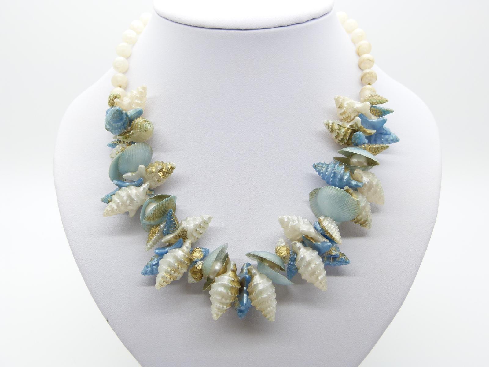 Vintage 50s Quirky White and Blue Plastic Shell Charm Bead Necklace