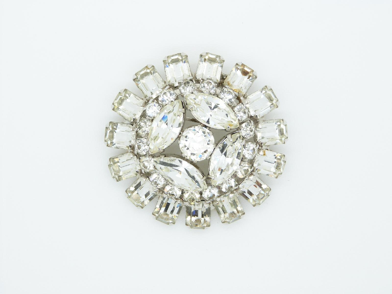 Vintage 1950s stunning signed Weiss large circular domed silvertone brooch set with large rhinestones/diamante stones in varying shapes and sizes.  Stamped Weiss on reverse of brooch, amazing quality and in excellent condition does not look like it has ever been worn, this really is a fabulous collectors piece. Measures 4cms across.