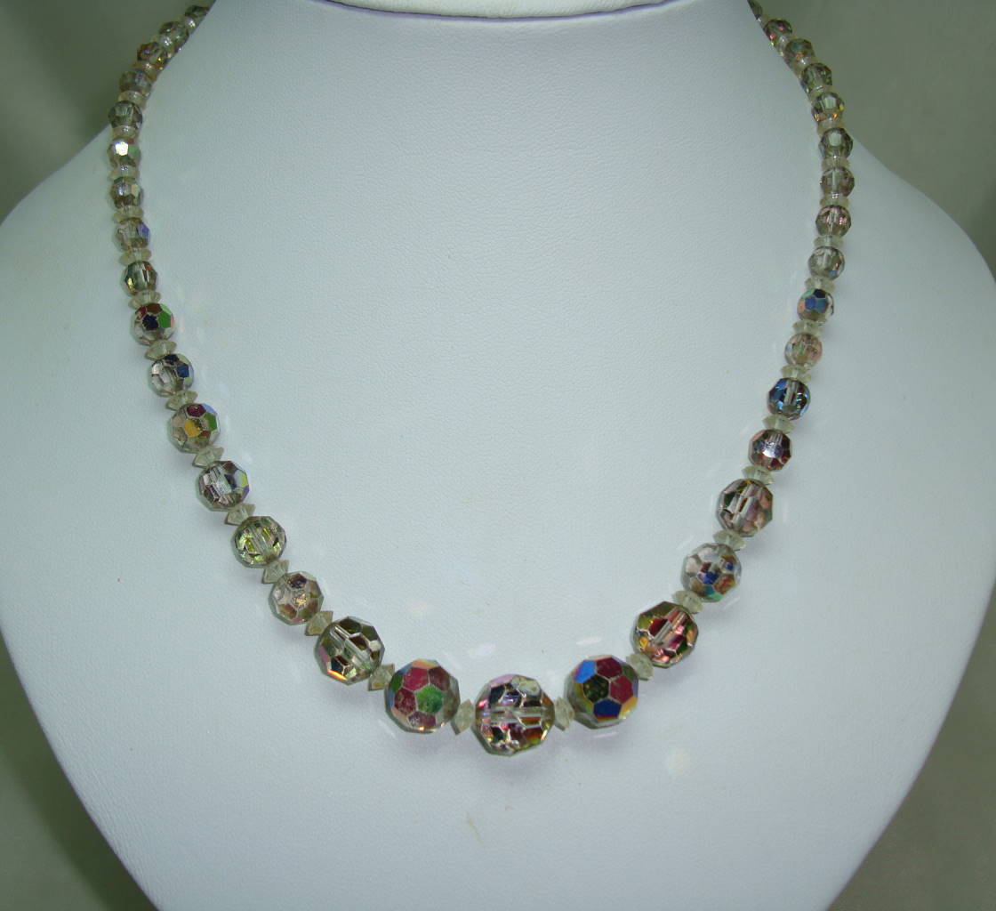 Vintage 50s Sparkling AB Crystal Glass Graduating Bead Necklace