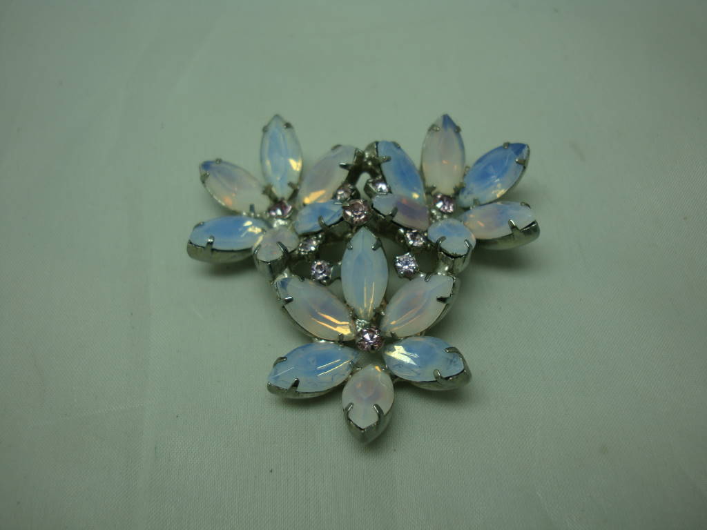 Vintage 50s Stunning Large Opaline Glass and Diamante Flower Brooch