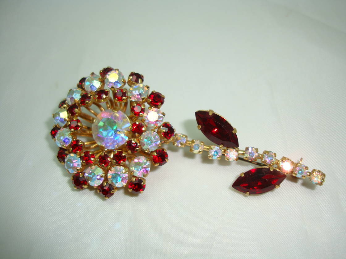 Vintage 50s Stunning Quality Red & AB Diamante Flower Brooch