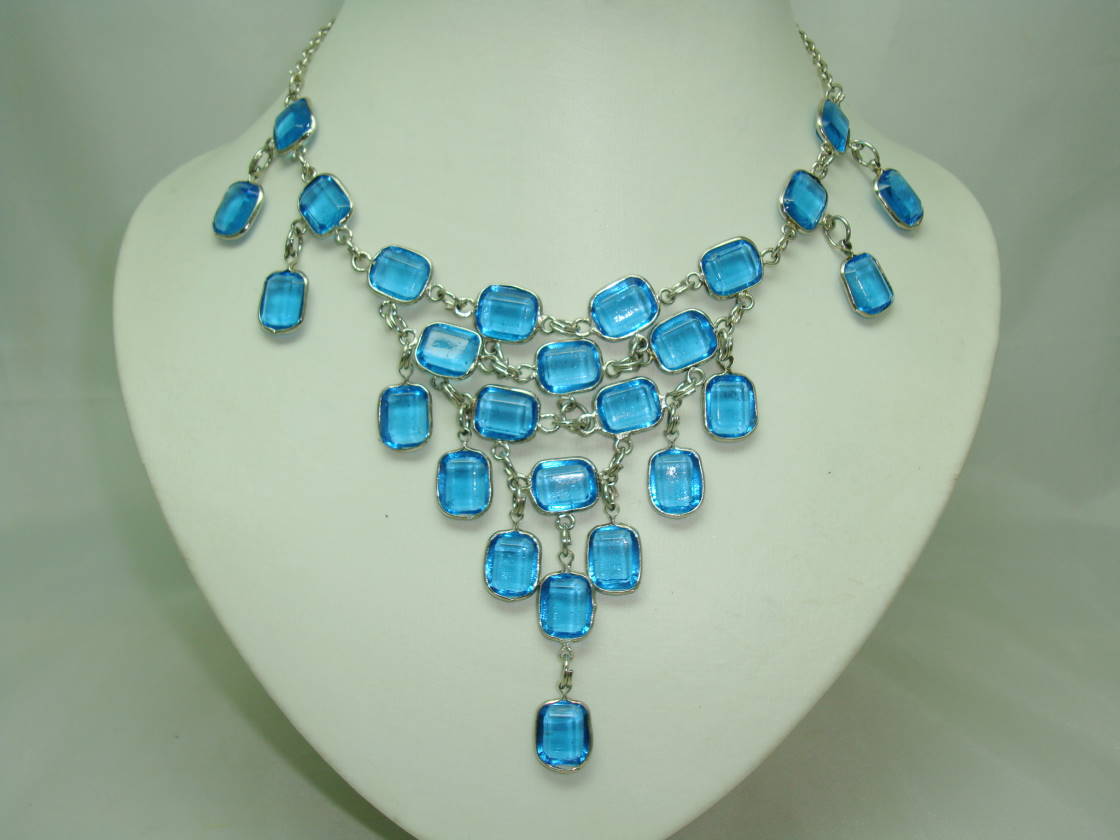 Stunning vintage 1950s style teal blue glass drop cascade bib style silvertone necklace which is just fab.  Excellent condition as item is new, looks amazing on, very well made and eye catching, a fabulous necklace!