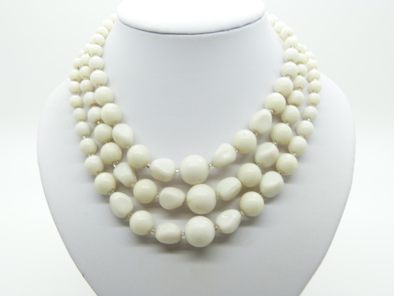 Vintage 50s Three Row Pretty White Plastic Bead Necklace Unusual Shape