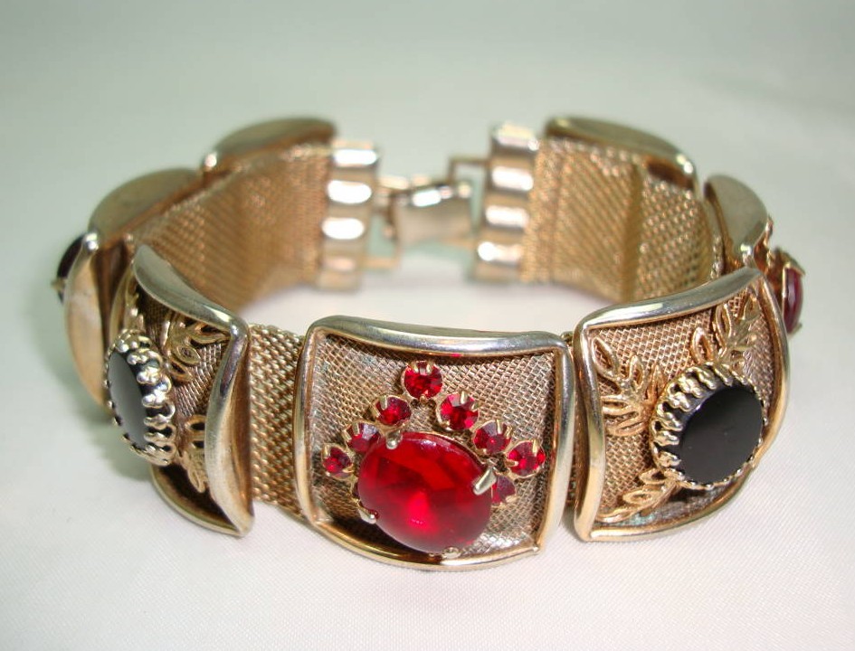Vintage 50s Wide Gold Link Red & Black Diamante Bracelet