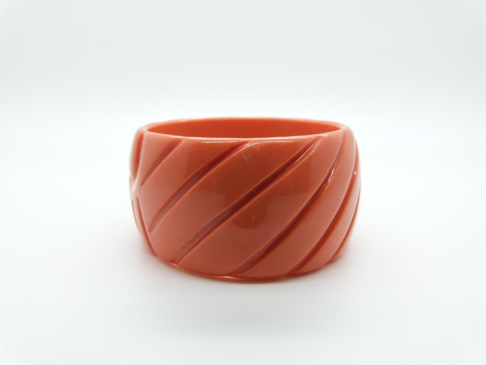I am pleased to offer this beautiful vintage bright, carrot-colored wide bangle with a carved, abstract, geometric design reminiscent of a sunray design.