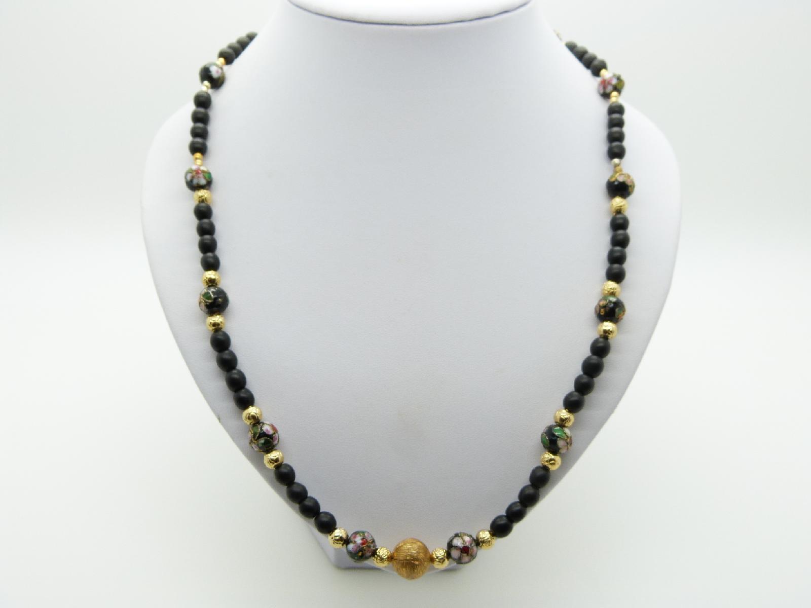 Vintage 80s Fab Black Glass Bead Gold and Cloisonne Flower Necklace