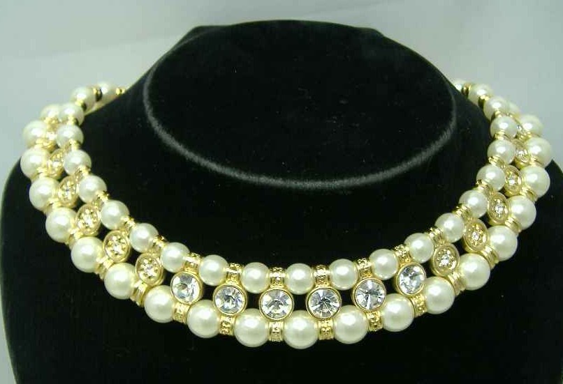 Vintage 80s Faux Pearl Bead & Diamante Choker Necklace
