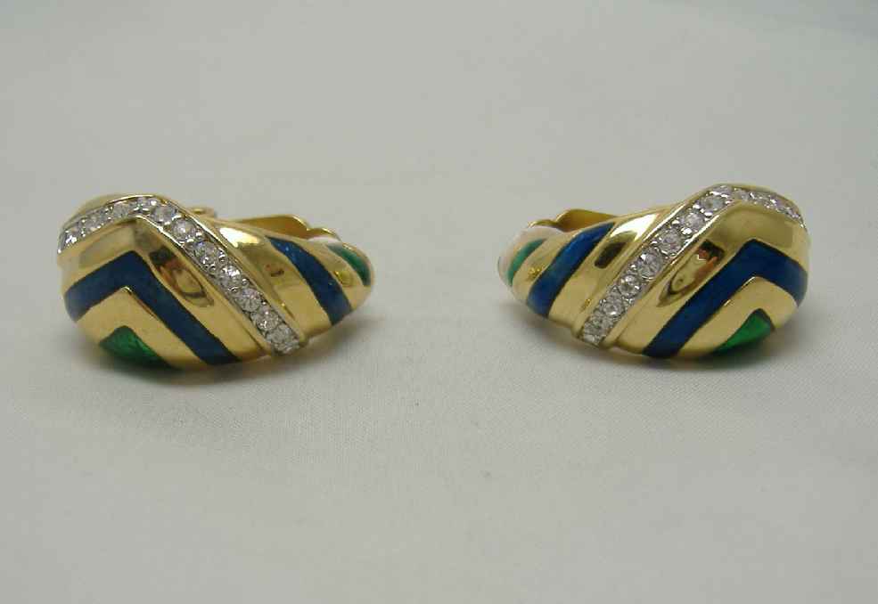 Vintage 80s Quality Blue Green Enamel Diamante Gold Clip on Earrings