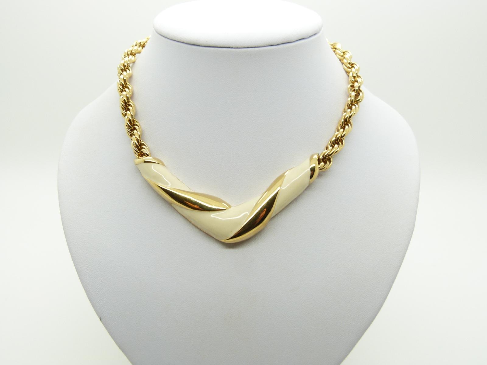 Vintage 80s quality cream enamel and goldtone v shaped chunky chain necklace, excellent condition, does not look like it has ever been worn, measures 41cms, this necklace is very weighty and good quality, this is an unsigned designer piece.