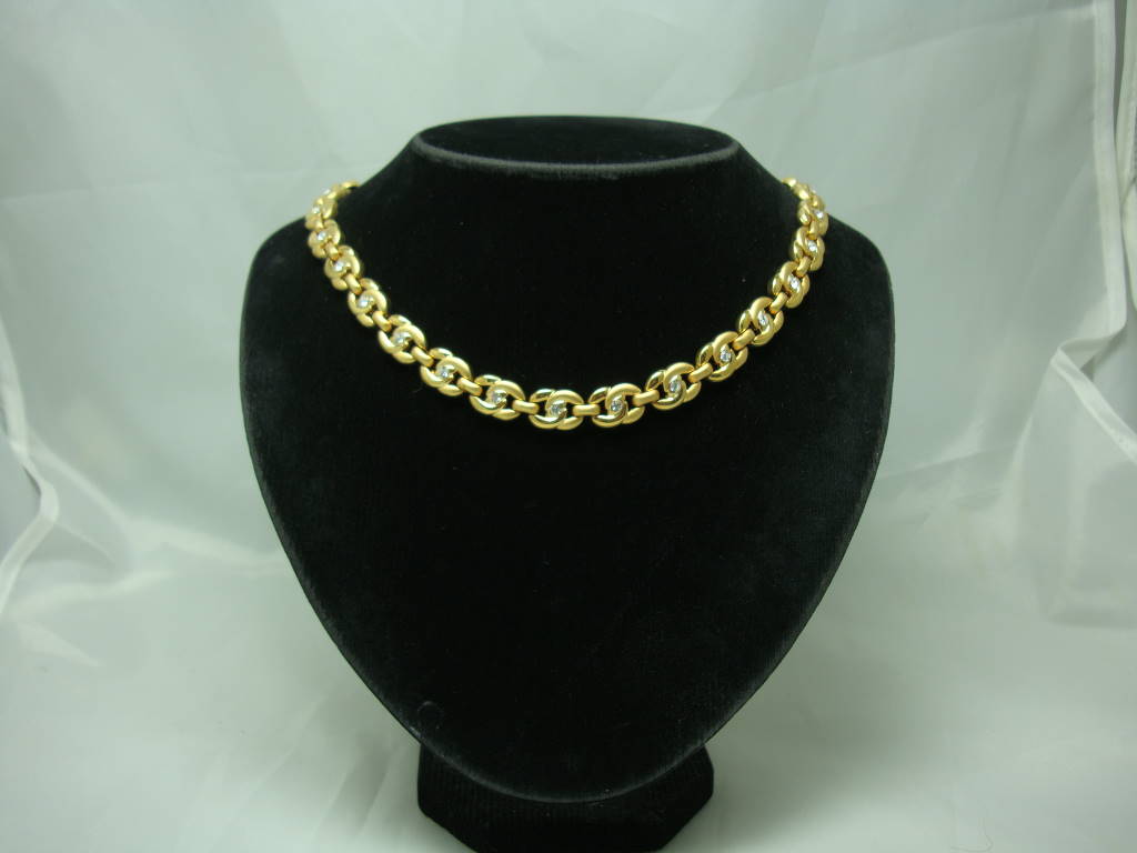 We are pleased to offer this fabulous vintage 1980s quality fancy goldtone link necklace studded with sparkling diamante stones.  As you can see from the photos is in excellent condition and looks stunning on.  The necklace is made up of unusual links - one half of the link is brushed gold and the other side is polished - very effective.  This necklace would look great worn with anything, don't miss out on this one.