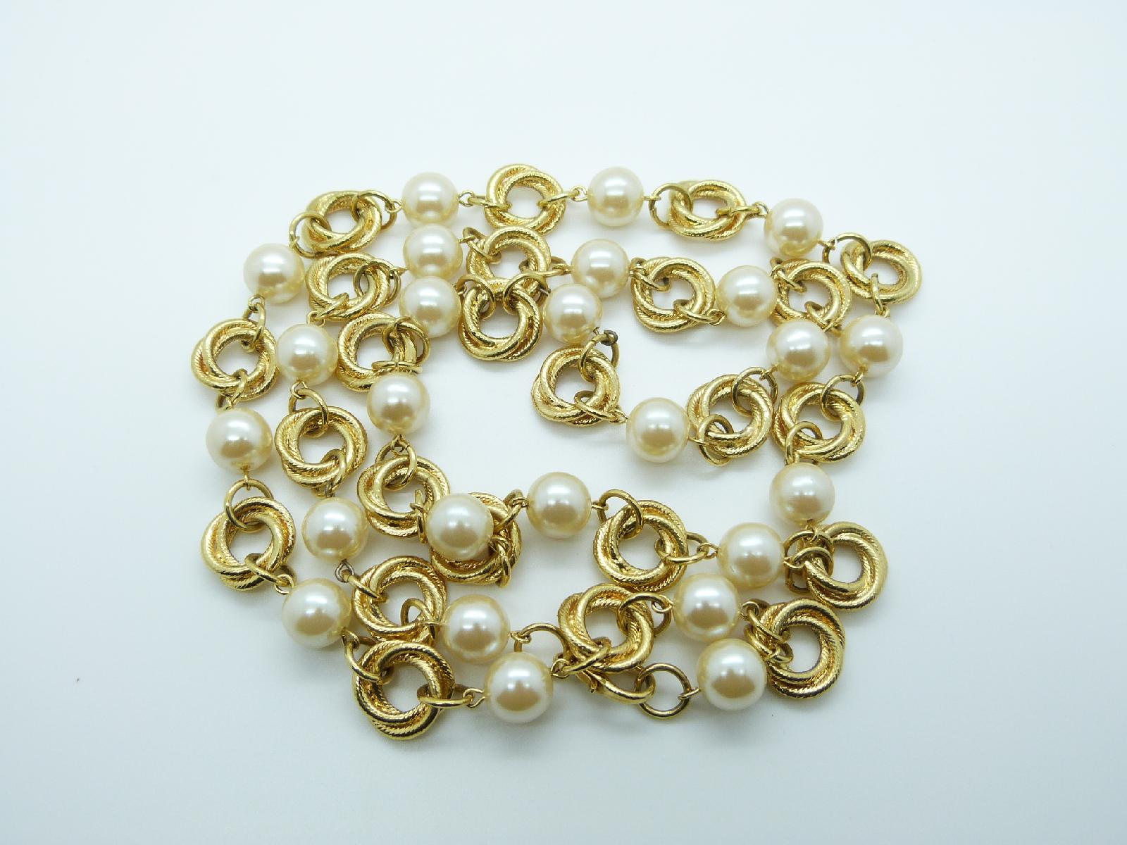 Vintage 1980s stylish long gold plated double link necklace interspersed with glass faux pearl beads, excellent condition, looks stylish on, fastens with a lobster claw clasp (this was added by myself as the necklace can now be worn wrapped around twice for a different look).  Really good quality, a timeless addition to your jewellery wardrobe.  Measures 103cms.