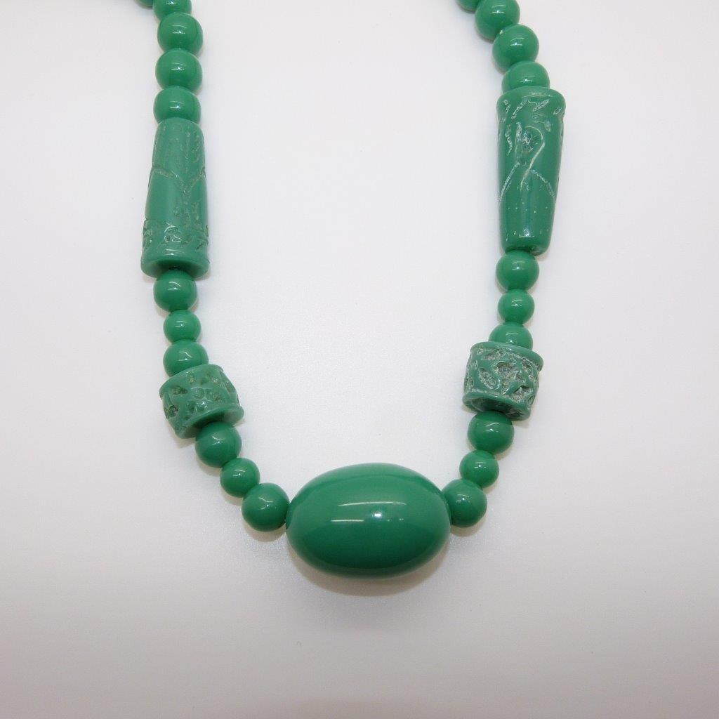 Vintage Chunky Green Carved Plastic Long Bead Necklace Chinese Inspired WOW