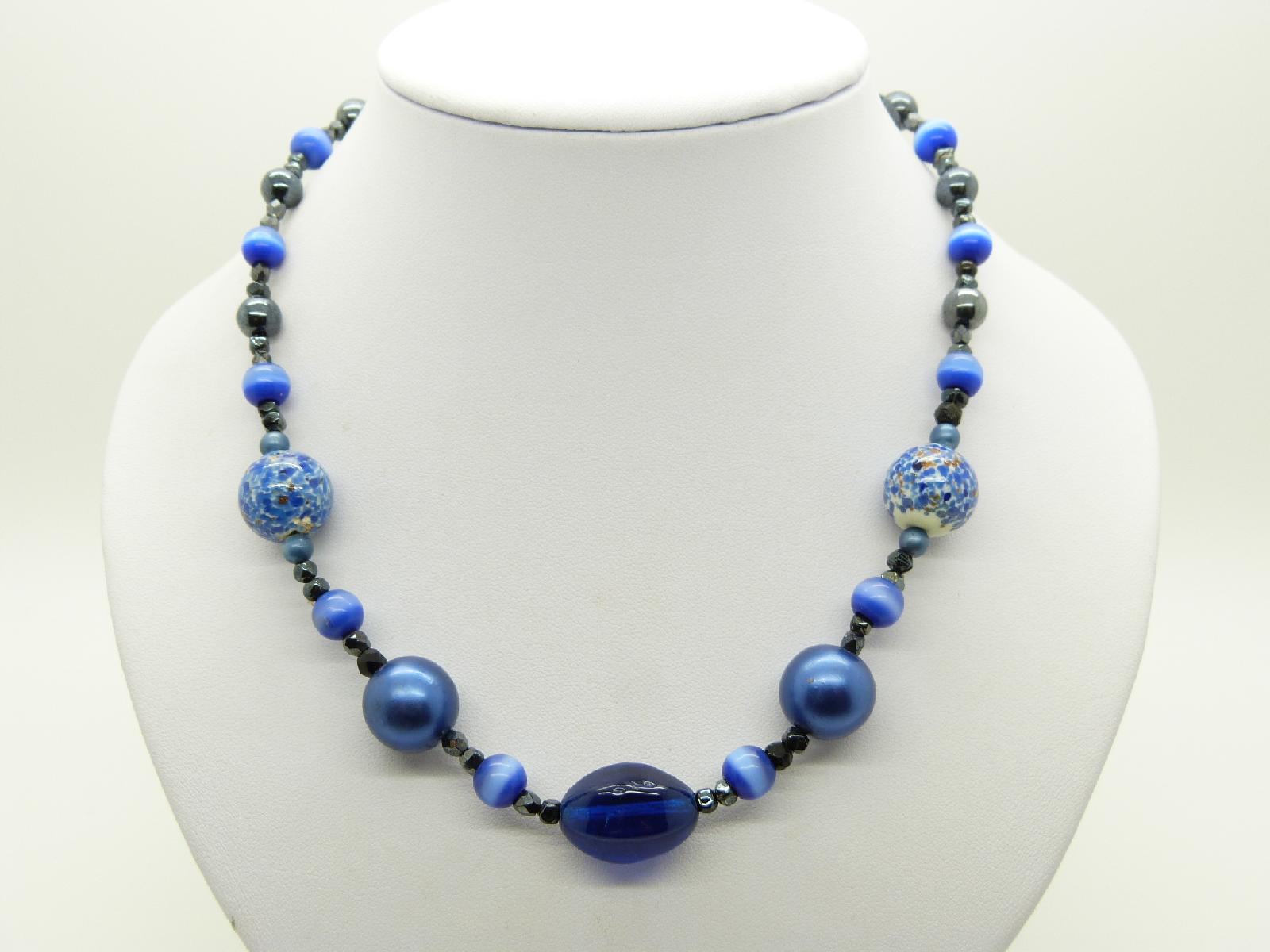 Vintage redesigned blue glass and hematite bead necklace made up of various vintage assorted beads, one off unique design, length 47cms.