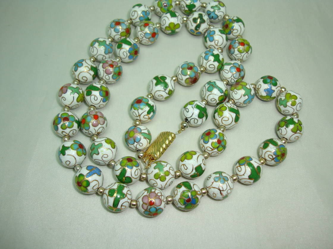 Lovely long cloisonne enamelled bead necklace in shades of white, green blue and gold featuring beautiful little flowers.  Interspersed with gold spacer beads, fastens with goldtone clasp, excellent condition as they are new, looks very attractive on, a good weight to this one as well.
